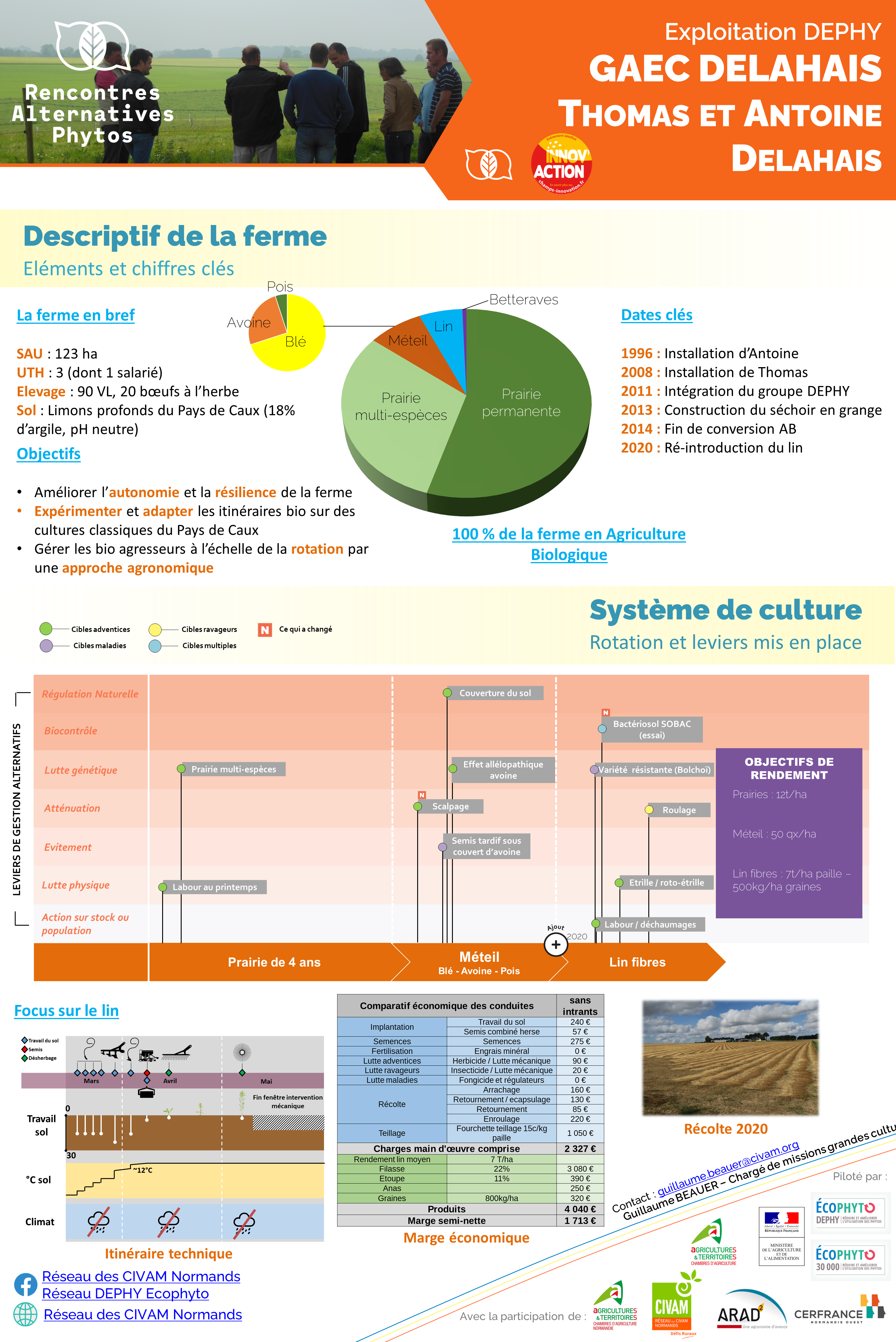 Déjà engagés dans une démarche de réduction poussée de l'utilisation de leurs intrants, les 12 polyculteurs éleveurs du groupe DEPHY de la Pointe de Caux cherchent à pérenniser et continuer leur travail, tout en maintenant une performance économique de leurs systèmes. Une grande partie du groupe étant historiquement engagée dans des MAEC Phyto, le groupe a déjà pu travailler extensivement sur des thématiques d'efficience et de substitution et s'attachent à présent à mettre en place des leviers de reconception pour gérer les adventices l'échelle de la rotation. Le développement de ces thématiques permettra notamment de répondre à des enjeux de gestion des adventices résistantes ayant fait leur apparition sur le territoire.