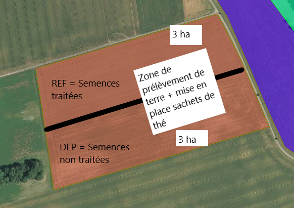 Chaque parcelle comprend 2 systèmes : 1 système de référence (REF) correspondant aux pratiques de l'agriculteur-expérimentateur (construit selon les principes de la protection intégrée) et 1 système DEPHY, à pratiques identiques excepté l'utilisation de traitements chimiques de semences (IFT Traitements de semence = 0)