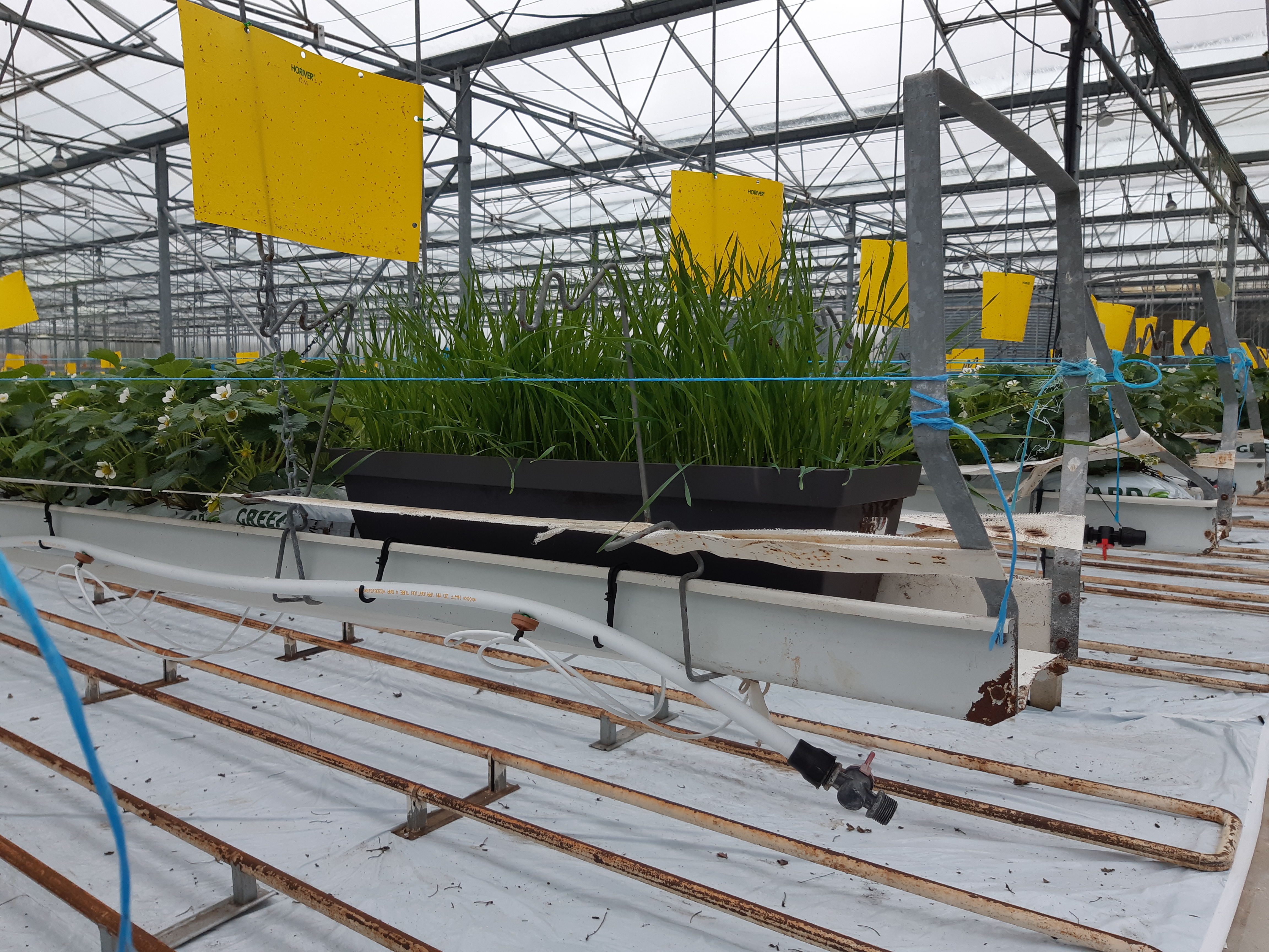 Des jardinières de graminées (triticales) sont réparties régulièrement au sein de la culture. Lorsque les plants sont suffisamment développés, des pucerons spécifiques des céréales sont inoculés. Ces pucerons vont attirer des micro-hyménoptères parasitoïdes qui sont également capables de parasiter certains pucerons présents sur les fraisiers. L'objectif est de bénéficier d'auxiliaires dans la culture avant la présence de ravageurs et des dégâts liés, et d'obtenir une action précoce.