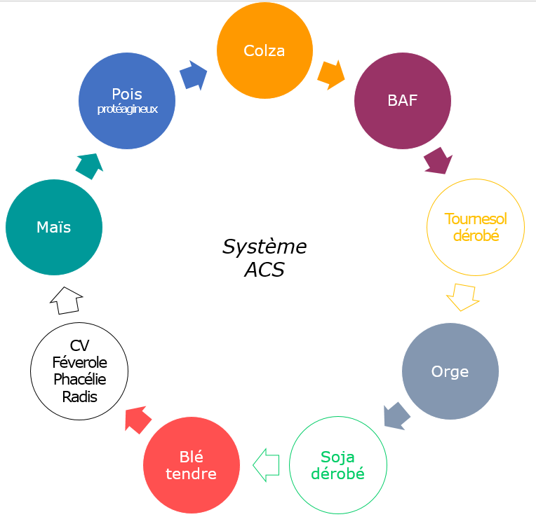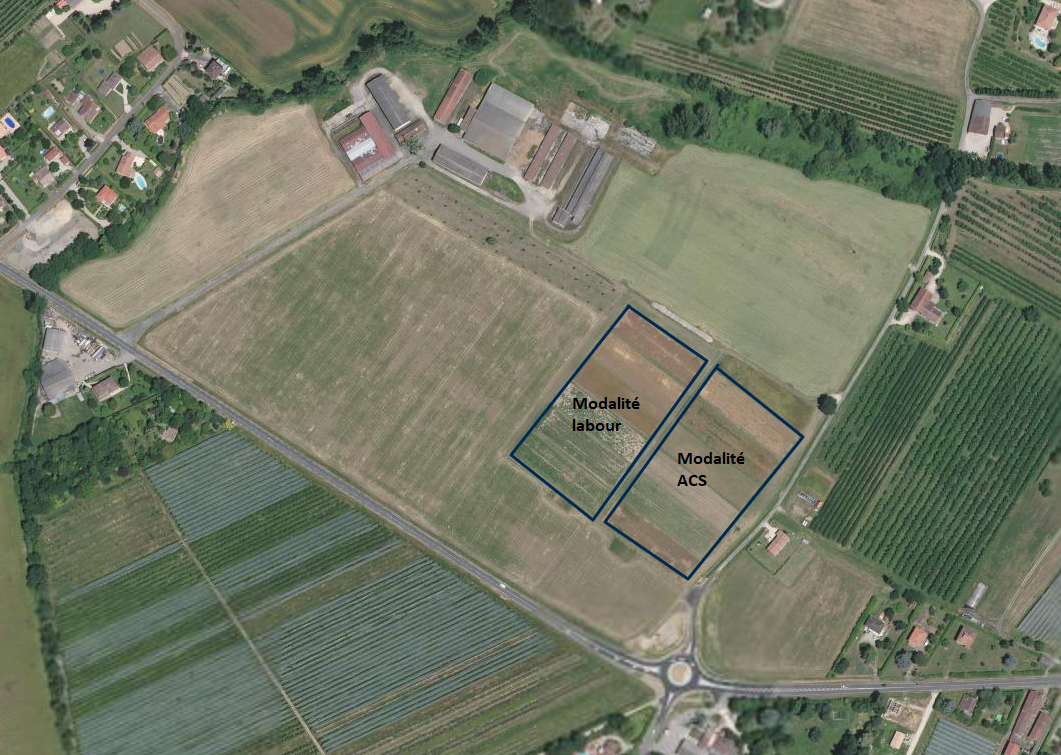 Description du dispositif expérimental Deux systèmes de culture indépendants sont suivis sur la plateforme, ils sont composés chacuns de 6 parcelles de 0.2 are (soit 24m x 80m). Le système travail du sol (avec labour possible) avec un objectif de réduction d'IFT 50%. Le système ACS avec un objectif réduction d'IFT 50% (projet REDUCE). Les travaux culturaux sont entièrement réalisés par un entrepreneur agricole. |