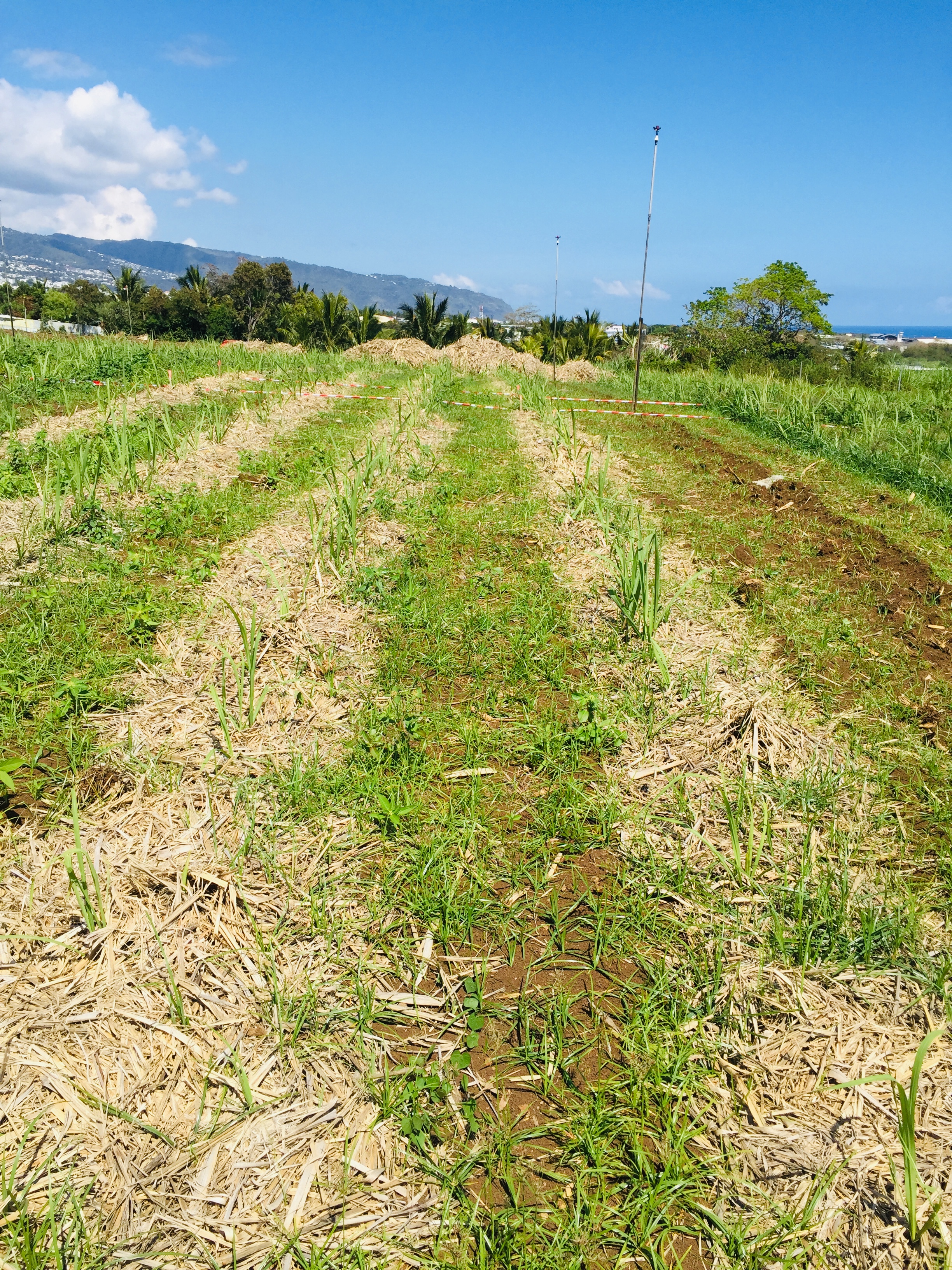 "Mené en condition expérimentale, cet essai permet de mettre en évidence le rôle de la paille de canne dans la maitrise de l'enherbement. De plus l'essai se propose de tester divers outils de désherbage mécanique attelés au microtracteur. Pour finir, la modalité menée à 0 IFT, permettra de mettre en évidence des aspects de conduite sans herbicides en canne à sucre".