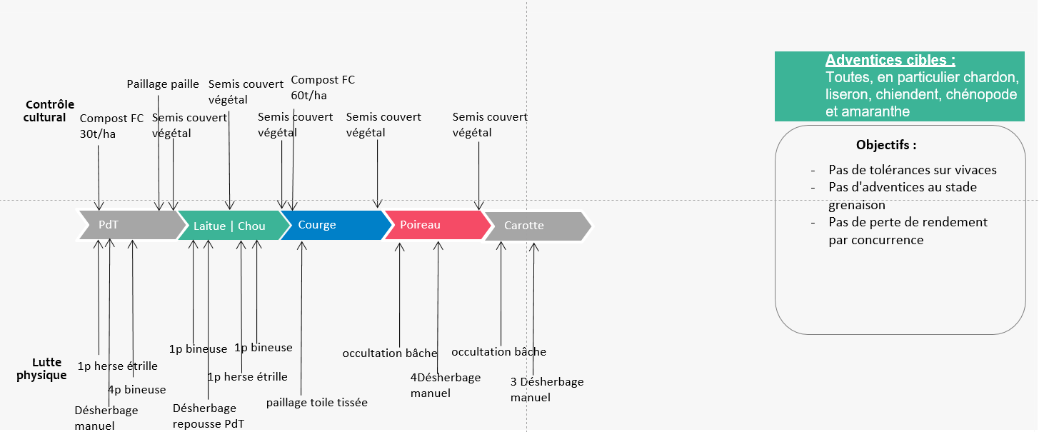 Avertissement : seuls les principaux leviers mis en œuvre dans le cadre de l’expérimentation et permettant une réduction de l’utilisation des produits phytosanitaires sont présentés sur ce schéma. Il ne s’agit pas de la stratégie complète de gestion des adventices.