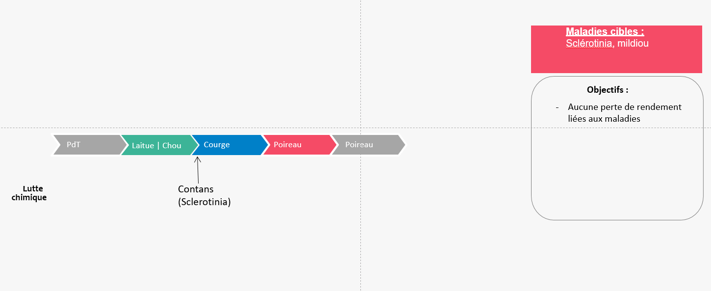 Avertissement : seuls les principaux leviers mis en œuvre dans le cadre de l’expérimentation et permettant une réduction de l’utilisation des produits phytosanitaires sont présentés sur ce schéma. Il ne s’agit pas de la stratégie complète de gestion des maladies.