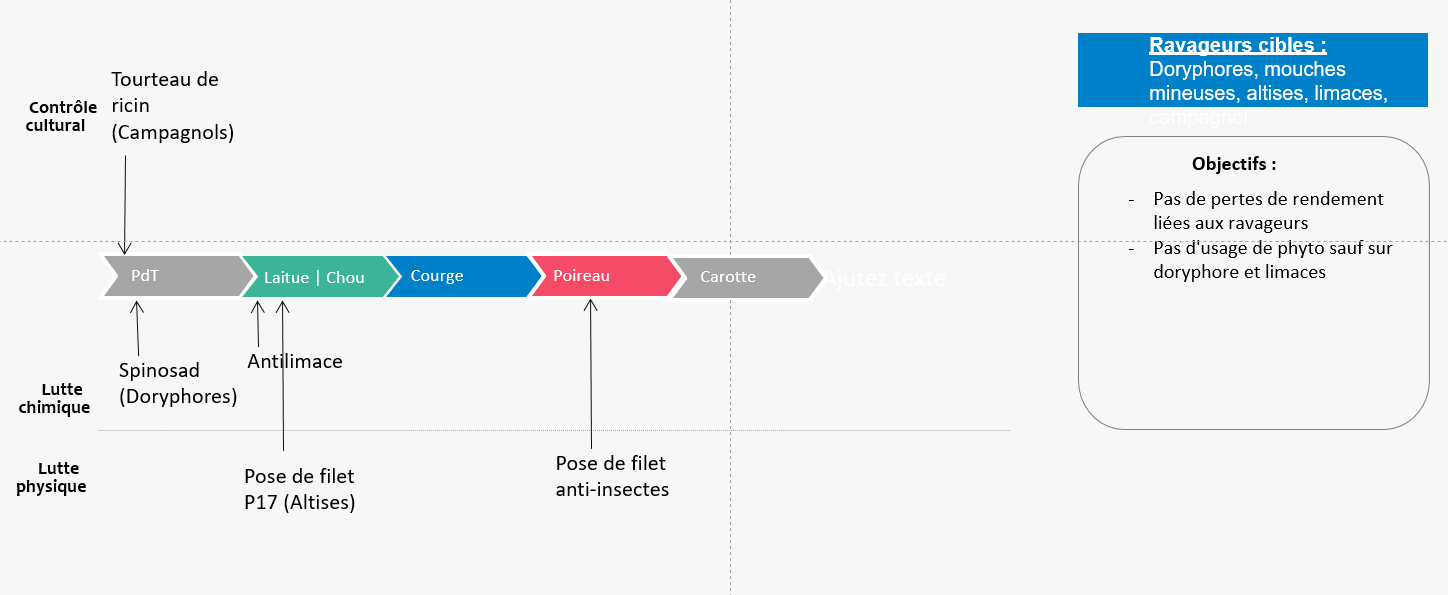 Avertissement : seuls les principaux leviers mis en œuvre dans le cadre de l’expérimentation et permettant une réduction de l’utilisation des produits phytosanitaires sont présentés sur ce schéma. Il ne s’agit pas de la stratégie complète de gestion des ravageurs