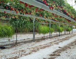Dans le système testé par l'APREL, des lignes de bacs destinés aux plantes de service ont été spécialement installés sous les gouttières de fraisiers à raison d'une ligne de 30 m pour 1 000 m². Dans ces bacs diverses plantes de services sont semées ou plantées. |