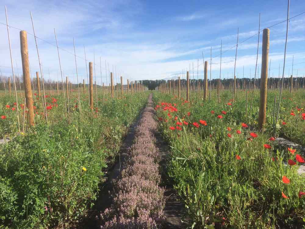 Gestion de l’irrigation et de la fertilisation : goutte à goutte en surface les deux premières années puis fertirrigation enterrée à 70 cm de profondeur Gestion du sol : tonte de l'inter-rang, enherbement sous le rang avec des épervières piloselle implantées sur paillage biodégradable, toile tissée sous le thym Infrastructures agro-écologiques : haie diversifiée, enherbement diversifié, gîtes à chauve-souris, perche à rapaces, abris à reptiles, nichoirs à passereaux et chouette chevêche |