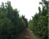 Système d’irrigation : microjet sous frondaison Gestion de la fertilisation : Fertilisation minérale : 2 apports au sol au printemps ; fertirrigation en saison (apports réalisés tout les 15 jours) ; 1 apport au sol en septembre (mise en réserve) Infrastructures agro-écologiques : Pas d'infrastructure agro-écologique mise en place. Haie composite au nord de la parcelle. Protection physique : Absence de protection physique du verger |