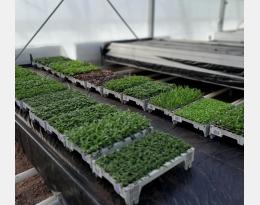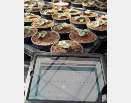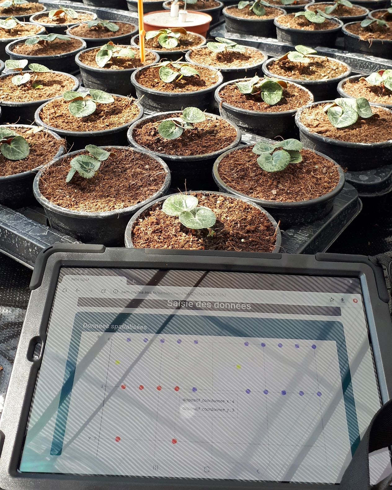 Infrastructures agro-écologiques : Plantes de service dans la culture : Plantes pièges d'Heuchère en culture de cyclamen Rempotage : Culture en pots de 0,5 à 1L, cultivés en plaque Substrat Horticole avec engrais enrobés