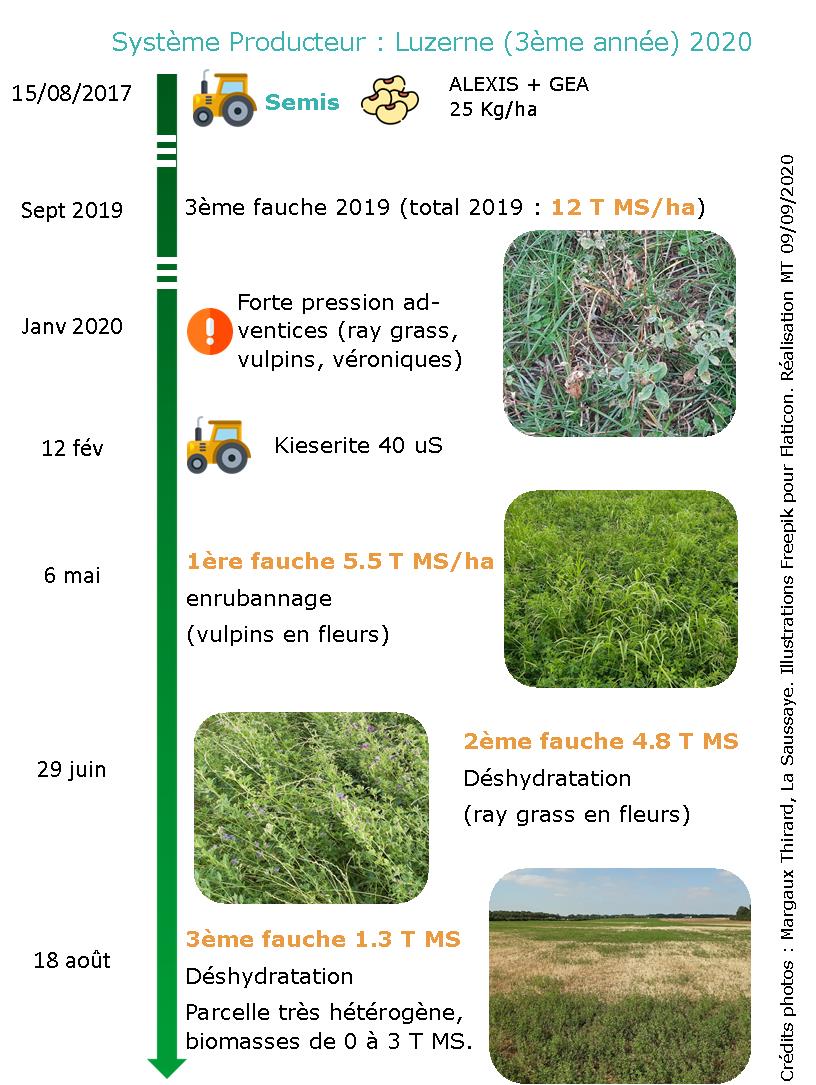 Interculture : absence de couverts en interculture. Lutte contre les vivaces par des déchaumages répétés. Gestion de l'irrigation : absence d'irrigation. Fertilisation : apports de compost de fumier équin systématique de 2010 à 2017 + bouchons ou fientes. Travail du sol : labour systématique. Binage d'un maximum de cultures (y compris céréales). Infrastructures agro-écologiques : haie adjacente à la parcelle, voir la page SITE La Saussaye.