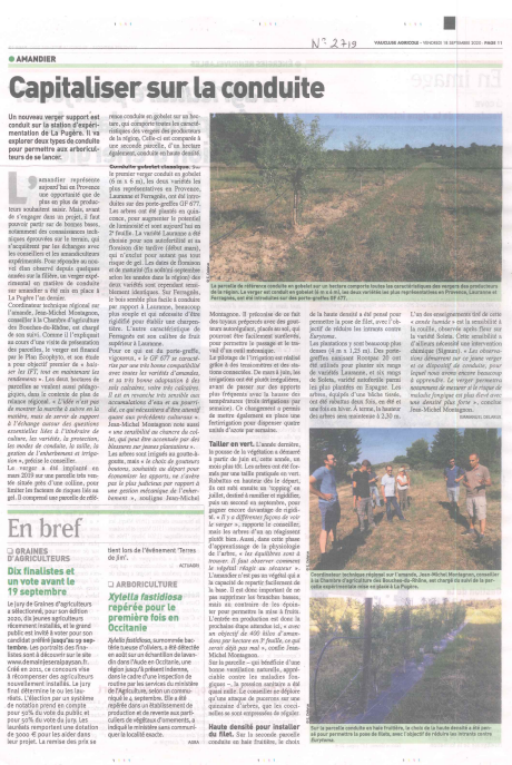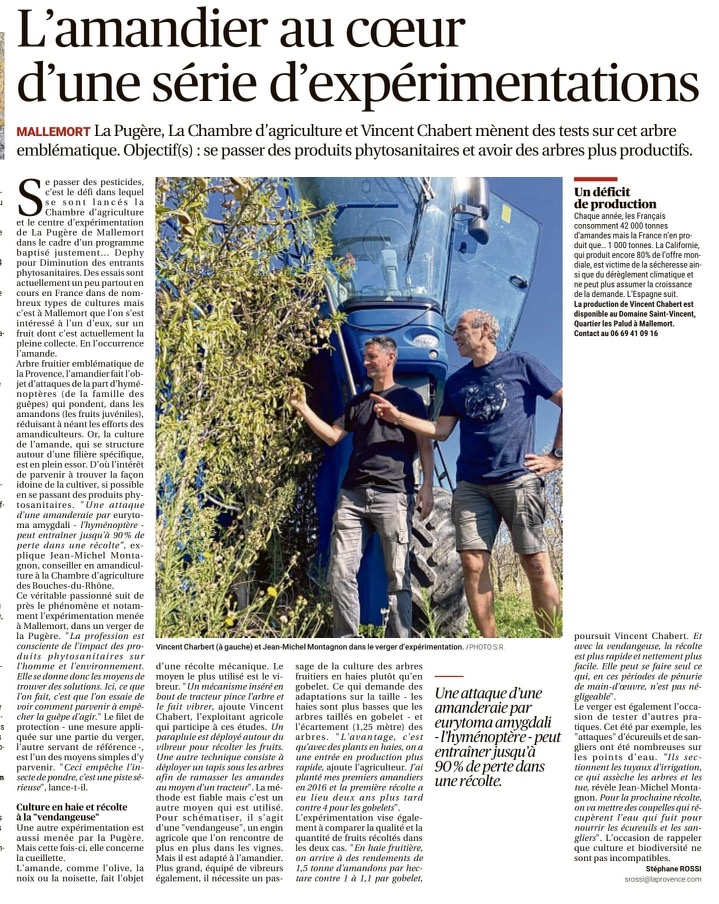 Transfert de certains leviers de l'essai. Concernant le levier variétal, la variété Soleta, donnée comme peu sensible aux champignons de blessure (Fusicoccum amygdali et Monilia) s'est montrée particulièrement sensible à la Rouille (Tranzchelia pruni-spinosae) et au Coryneum. C'est une information essentielle qui va orienter les choix variétaux et/ou justifier la mise en place d'une protection fongique très rigoureuse sur cette variété. Concernant la bâche tissée au sol, son efficacité est optimale si elle est bien entretenue. On peut ainsi transférer l'idée d'un système efficace, de coût raisonnable, qui permet d'oublier complètement la problématique du désherbage sur le rang de plantation. Par contre, à déconseiller fortement dans les terrains avec risques de campagnols. Concernant les bandes fleuries, transférable également, de bons résultats si elles démarrent bien et se maintiennent. Cela est naturellement lié à la présence de pluies après semis. Ces bandes fleuries attirent les insectes auxiliaires comme les Syrphes et les Chrysopes qui viennent se nourrir de nectar. Ils passent ensuite sur les amandiers pour consommer les pucerons présents. Par contre, difficile aujourd'hui à gérer, l'arrêté abeille imposant une tonte des fleurs en saison si usage d'insecticides. Concernant le filet, il ne peut être dissocié du mode de conduite, c'est-à-dire qu'il ne peut être transféré que sur des vergers en haie fruitière. Mais ce mode de conduite peut se développer car de nouveaux essais sont en place avec un accès plus facile aux systèmes de récolte traditionnels et des rendements élevés. Concernant l'efficience des traitements, nous avons constaté la possibilité de se passer d'un IFT cuivre si encadrement de la floraison rigoureuse et interventions pertinentes en saison selon les durée d'humectation. Sur les cicadelles (Assymetrasca decedens) et le lépidoptère Anarsia lineatella, les attaques considérées comme moyennes sur les vergers d'essai n'ont pas nécessité d'intervention. Cela sous entend néanmoins de bien identifier la notion de dégâts acceptables.