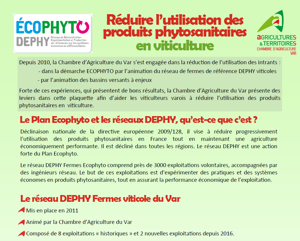 Le réseau DEPHY Fermes viticole du Var a été mis en place en 2011. Il regroupe 11 exploitations viticoles du Var : 4 coopérateurs, 5 vignerons indépendants et 2 vendeurs de raisin sur pied. 5 exploitations sont en viticulture biologique (dont 1 en HVE) et 6 en conventionnel (dont 1 en HVE). Les exploitations sont disséminées sur plusieurs communes du Var : Roquebrune sur Argens, La Motte, Figanières, Lorgues, Pontevès, Les Mayons, La Roquebrussanne et Ramatuelle.