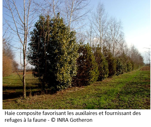 - Fiche Système DEPHY arboriculture Ecophyto 2 Bio : Implantation d’une haie haute en bordure de parcelle pour favoriser le refuge des auxiliaires, ainsi qu’ajout d’abris à hulotte et à chauves-souris et d’un hôtel à insecte pour favoriser la régulation naturelle des ravageurs.