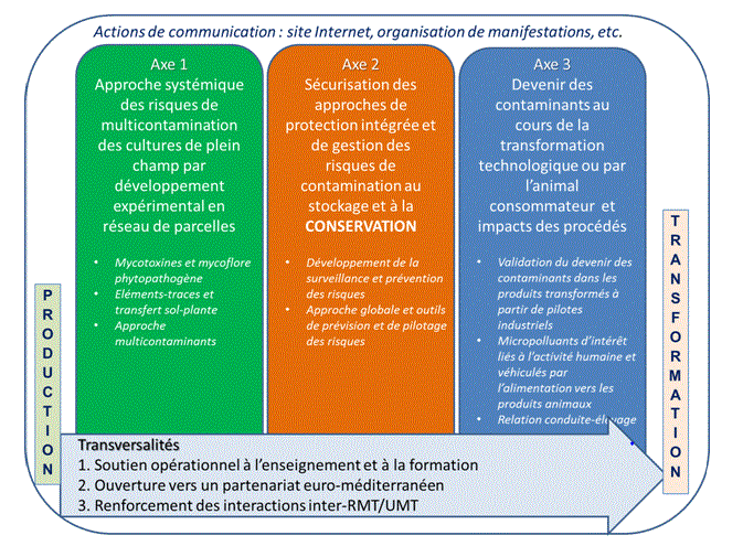 Les travaux du RMT portent sur l’origine, le devenir et la maîtrise des contaminants et organismes indésirables qui font peser des risques sur la qualité sanitaire, à toutes les étapes de la chaîne alimentaire : mycotoxines, éléments traces métalliques, résidus de produits phytosanitaires, insectes causes d’infestations des denrées stockées, microflore fongique phytopathogène en pré- et post-récolte, autres contaminants potentiels (polluants organiques persistants) ou contaminants émergents.
